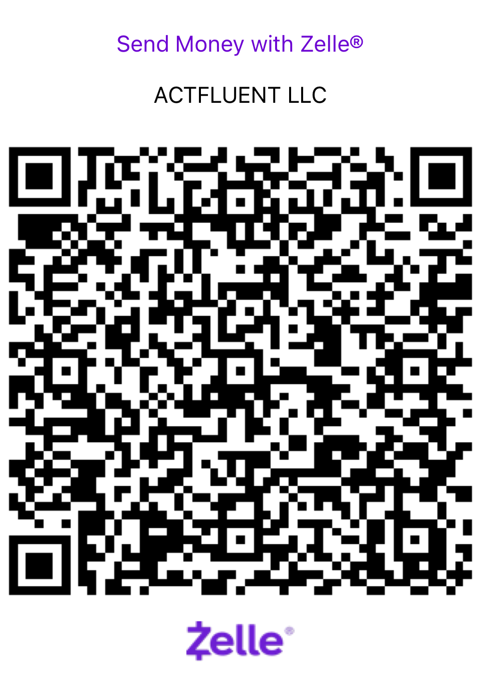 A Zelle QR code for sending money, with instructions at the top reading 'Send Money with Zelle®', and the company name 'ACTFLUENT LLC' above the QR code, and Zelle logo below.